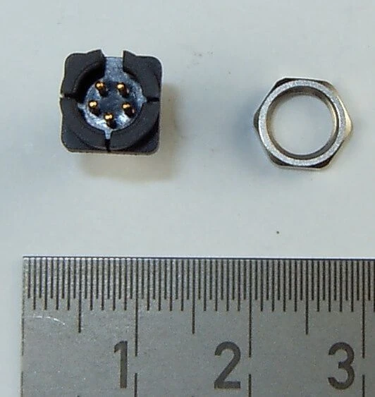 1 St. 5-polige Miniatur-Steckverbindung. Einbau-Dose (Stecker), verpolungssicher. Ca. 8x8x17mm mit Lötanschluss. Mit Befestigungsmutter. Belastbarkeit 60V/3A je Kontakt.